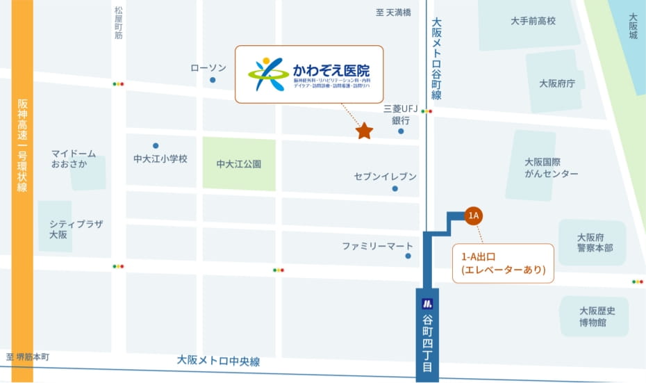 - 大阪メトロ谷町線『谷町4丁目駅』4番出口から徒歩3分(坂なし)※1-A出口には、エレベーターあり